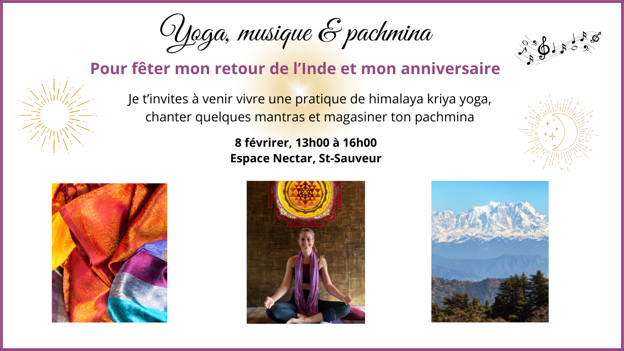 Pour célébrer mon retour de l’Inde et mon anniversaire, je t’invite à une après-midi unique où se rencontrent Himalaya Kriya Yoga, mantras et pashminas sacrés.